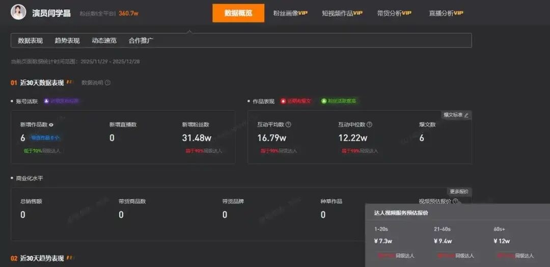 第三方平台数据显示好牛配资,闫学晶的某社交平台账号名为“演员闫学晶”,近期新增了31.48万粉丝,总粉丝数为360.7万,其1到20秒视频广告预估报价7.3万元,21到60秒视频广告预估报价9.4万元,60秒以上视频广告预估报价为12万元。